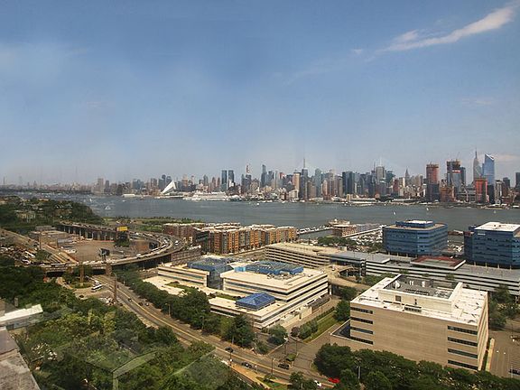 Giant 1BR, panoramic views!Located in a quiet residential section of bustling Union City, this spacious and bright unit is the rarest and largest 1-bedroom in fabulous, full-service Troy Towers. Its generous 940 sq. ft. includes huge living room, entry foyer, separate dining area and separate glassed-in sun room. Enjoy sweeping views of the Empire State Building, mid-upper Manhattan, GW Bridge, Weehawken reservoir, and Ramapo Mountain vistas. Apartment has clean white ceramic tile floors throughout, updated bathroom, endless closets and custom built-in California-style cabinetry that coordinates from the kitchen to the dining room, hallways, and bedroom. All-white kitchen has coordinated Sub-Zero and GE Profile appliances, marble-like Corian counters, and windowed breakfast bar in the dining area. Transportation is easy with NYC buses, ferry and PATH shuttles at front door during rush hours. Flat additional fee of $100/mo. covers ALL utilities (heat/hot water, AC, electric!) plus basic cable TV with 2 boxes. Landlord pays $500 move-in/move-out fee! Building has 24/7 concierge and security, free use of seasonal swimming pool, garage parking, and gym for reasonable extra fees.