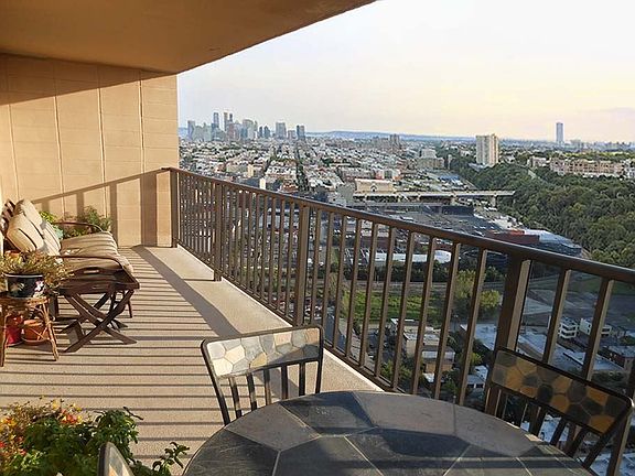 Sun-flooded treasure, panoramic views, huge terrace! If you're looking for "Sunset City and Closet Heaven," this is the place! Spacious, renovated high-floor apartment in fabulous Troy Towers has 270-degree views of city, river, reservoir, and distant Garden State vistas. Enjoy it all while dining al fresco on your giant terrace with balmy breezes and spectacular sunsets. All-new kitchen has convenient and stylish two-tier breakfast bar with chic Edison-illuminated crystal pendant lights, espresso wood cabinets, hi-tech stainless appliances, and pearlized stainless mosaic backsplashes. Bathroom is tastefully renovated with contrasting wood-tone tile, gleaming porcelain vessel sink, and glassed-in shower. Wood floors shine throughout; entry hall is lined with mirrored closets for abundant storage. Excellent value, priced to sell! Maint. fee includes ALL utilities, real estate taxes, basic cable TV with 2 boxes, and free use of seasonal swimming pool. Free weekday shuttles to Ferry & Light Rail, a.m. to PATH. NYC bus at front door, weekdays. Free limited shared storage on each floor; bike storage for $40/year. Garage parking available for $150/mo.; gym $240/year. Please note: the coop board approves purchases for owner-occupancy only, and Troy Towers does not allow dogs.