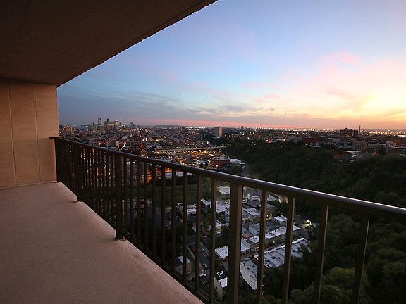 This extra-large, sun-flooded apt. has breathtaking 270-degree views from its 26-ft private corner terrace. Enjoy bright southern light, spectacular sunsets, and picture-perfect city, river, and mountain panoramas. Apt has huge updated kitchen with generous counter space/breakfast bar; neat and easy tile floors throughout, tons of mirrored closets. Easy commute with NYC buses and shuttles at front door, on-site fitness center and garage parking available. Available to close as of Dec. 7.