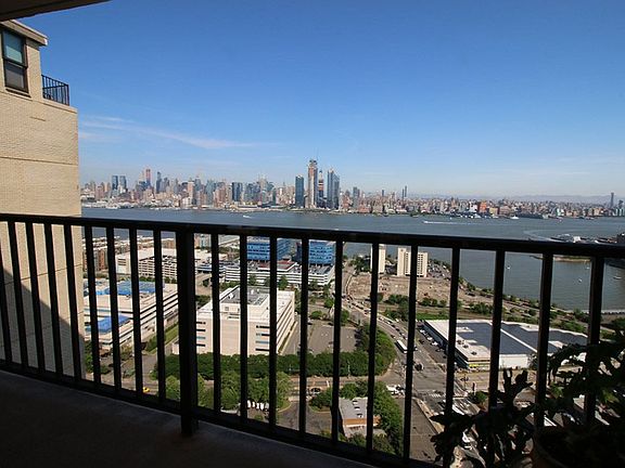 Spectacular NYC views, huge terrace! You'll be on top of the world in this lovely one-bedroom set high in the sky with panoramic city and river views from each room. A big picture window in the living room is your 24/7 "living cityscape" and a 28-foot private terrace is your perfect perch for serving coffee or cocktails while gazing at never-ending Hudson River happenings. Beautiful natural cherry hardwood flooring graces the entry and living area; brand-new complementary patterned tile in bedroom completes the warm and cozy look. Separate kitchen provides a private work area, or remove the privacy walls and design your own wide-open "great room" for collaborative serving and entertaining. Unbeatable view, unbeatable value - prices are going up, up, up! Troy Towers is a luxury hi-rise coop featuring on-site garage parking, outdoor pool, concierge, gym, valet service, and laundry on every floor. Maint. fee includes ALL utilities, real estate taxes, basic cable TV with 2 boxes, and free use of seasonal swimming pool. Free weekday shuttles to Ferry & Light Rail, a.m. to PATH. NYC bus at front door, weekdays. Free limited shared storage on each floor; bike storage for $40/year. Garage parking available for $150/mo.; gym $240/year. Please note: the coop board approves purchases for owner-occupancy only.(Sorry, Troy Towers does not allow dogs.)