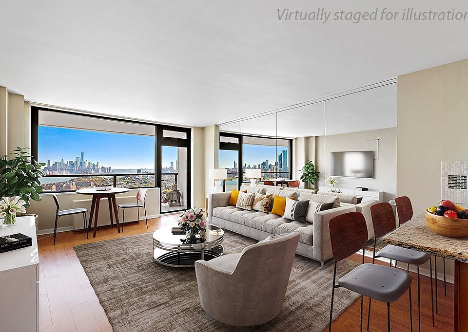 Drop-dead NYC views! Sky-high beauty, huge terrace! Take in spectacular, direct and panoramic views from your choice vantage point high above the Hudson River and iconic Manhattan skyline. Giant picture windows in each room and a dramatic mirrored wall in living room provide non-stop amazement and affirmation of why you live here! This tranquil oasis in the sky has cherry wood kitchen with granite counters and stainless appliances, rich natural wood flooring throughout, updated bathroom and all new closet doors. From coffee al fresco to midnight toasts, you'l enjoy dramatic sunrises, twinkling twilight and never-ending river action from your giant terrace in the sky. Move right in! Maint. fee is $924 including ALL utilities, high-speed Internet and cable TV with 2 boxes and HBO/Showtime, taxes are approx. $419/mo. for total fees of $1,343/mo. Free use of seasonal swimming pool, free weekday shuttles to Ferry & Light Rail and a.m. to PATH. NYC bus stops at front door, weekdays. Free limited shared storage on each floor; bike storage for $40/year. Garage parking available for $150/mo.; gym $240/year. Please note: the coop board approves purchases for owner-occupancy only, and Troy Towers does not allow dogs; sorry!