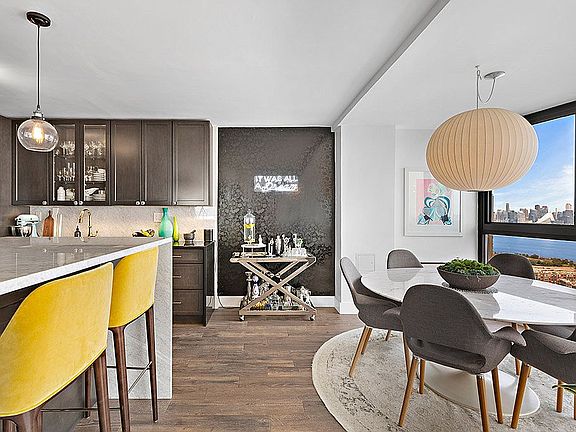 Beautiful unit, best location in Troy Towers! At last - the largest and most coveted 2-bedroom layout in Troy Towers - the "04-line" - with direct, panoramic Manhattan skyline views from the GW Bridge to the Verrazano. This elegantly re-styled, sky-high corner unit brings you bright eastern and southern exposure, easy-care wood-grain porcelain tile floors throughout, and king-size master bedroom suite with walk-in closet and one-of-a kind enlarged bathroom with private soaking tub alcove that's grandfathered and cannot be duplicated in Troy Towers! This beautiful home has a 26-foot wall of floor-to-ceiling windows to enjoy a birds-eye view of the glittering NYC skyline and blue waters of the Hudson River from dramatic dawn to twinkling twilight. The enlarged kitchen features espresso cabinets, pristine black granite countertops with chic white farmhouse sink, gleaming white Carrara marble waterfall breakfast bar, high-end stainless appliance suite by Fisher & Paykel and built-in wine cooler. Both bedrooms feature sunny southern city and river views and large closets. This heavenly unit is perched near the top of Troy Towers, where all new hallways, updated lobby, brand-new central HVAC system and riverview pool redesign are on their way and already in the budget! This well-built, well-maintained vintage hi-rise reigns as the best value and with the best City views on the Hudson. Maintenance includes high-speed Internet, cable TV service including HBO and Showtime, and all utilities - central air, heat, water, and electricity: $1,451 + Real Estate Tax = $2,127/mo. total. Troy Towers is a pet-friendly coop featuring on-site garage parking, outdoor pool, 24-hour security and concierge, gym, Amazon hub, available bike and personal storage, valet service, and laundry on every floor. NYC buses and free ferry and PATH shuttles leave from the front door during rush hour; five-minute drive to the Lincoln Tunnel. Located in an area once known as West Hoboken, this in-demand, highly owner-occupied building is the "best-kept secret on the Hudson." (Note: The coop board approves purchases for owner-occupancy only.)