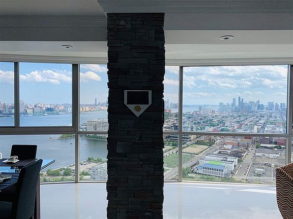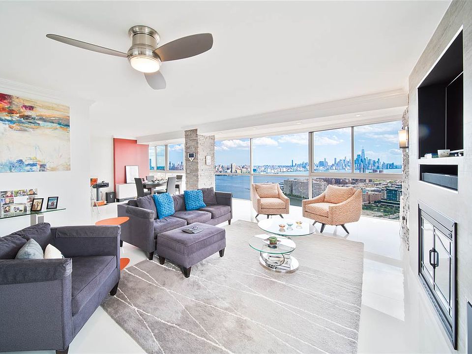 Beautiful and modern two bedroom two bathroom apartment with open space concept and lots natural light. Floor to ceiling windows in living room with breath taking views of NYC. Remote control window blinds system for center windows in living room, electric fire place and custom made glass, swiss steel bar. Restricted Porcelain Tile on all unit's floor, restricted Porcelain Tile on 80 percent of walls. Vanguard ceiling fans in all rooms. Quartz stone counters in kitchen with Kenmore Elite in all kitchen appliances. Large closet space in all rooms with smoked glass doors in all closets. All doors in unit are double cut custom made with virtual locks. Full steam room in master bathroom and self-cleaning jacuzzi in guest bathroom. Building offers free HUB Amazon package management system. Free shuttles to NY Waterway Ferry, Light Rail and PATH and NJ Transit bus direct to Port Authority in NYC making it very comfortable for NY commuters. Monthly maintenance fee includes association fees, real estate taxes, utilities, cable, swimming pool with stunning views of NYC, library, community room, 24 hr concierge and security. This is NJ Best-Kept-Secret 'Charm of the Hudson"!