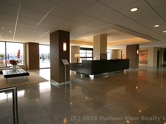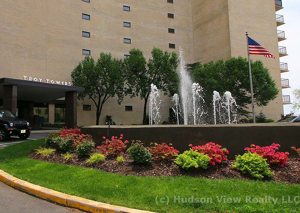 The largest one-bedroom in Troy Towers, this all-modern, "smart" apartment has been completely gut-renovated in stylish soft gray-and-white motif with fabulous storage space and comfortable, open floor plan. Operate all light switches and optional surveillance camera remotely from your smart phone; don't miss a minute of your favorite show with built-in TV monitor on your high-tech Samsung smart refrigerator! All matching stainless appliances and lighted sink faucet are framed with gleaming white quartzite countertops. A sunny alcove features floor-to-ceiling windows to enjoy glittering downtown City lights, spectacular sunsets, and cheery southern light throughout the day. Easy on the eyes, easy to decorate around, and super easy to maintain wood-look porcelain floors grace the expansive layout. The ultra-large living area has allowed for creation of a bonus room which can be used as a large walk-in closet or home office. All closets throughout have been fitted with IKEA custom cabinetry featuring delightful mirrored panels and flexible, modular interiors. The bathroom features beautiful textured tile and all new white fixtures with contrasting gray wall-mounted vanity. All-new HVAC units and included blackout drapes keep you cool and comfortable all year round. Furnishings can be included in price. Maint. fee includes ALL utilities, real estate taxes, basic cable TV with 2 boxes, and free use of seasonal swimming pool. Free weekday shuttles to Ferry & Light Rail, a.m. to PATH. NYC bus at front door, weekdays. Free limited shared storage on each floor; bike storage for $40/year. Garage parking available for $150/mo.; gym $240/year. Please note: the coop board approves purchases for owner-occupancy only, and Troy Towers does not allow dogs.