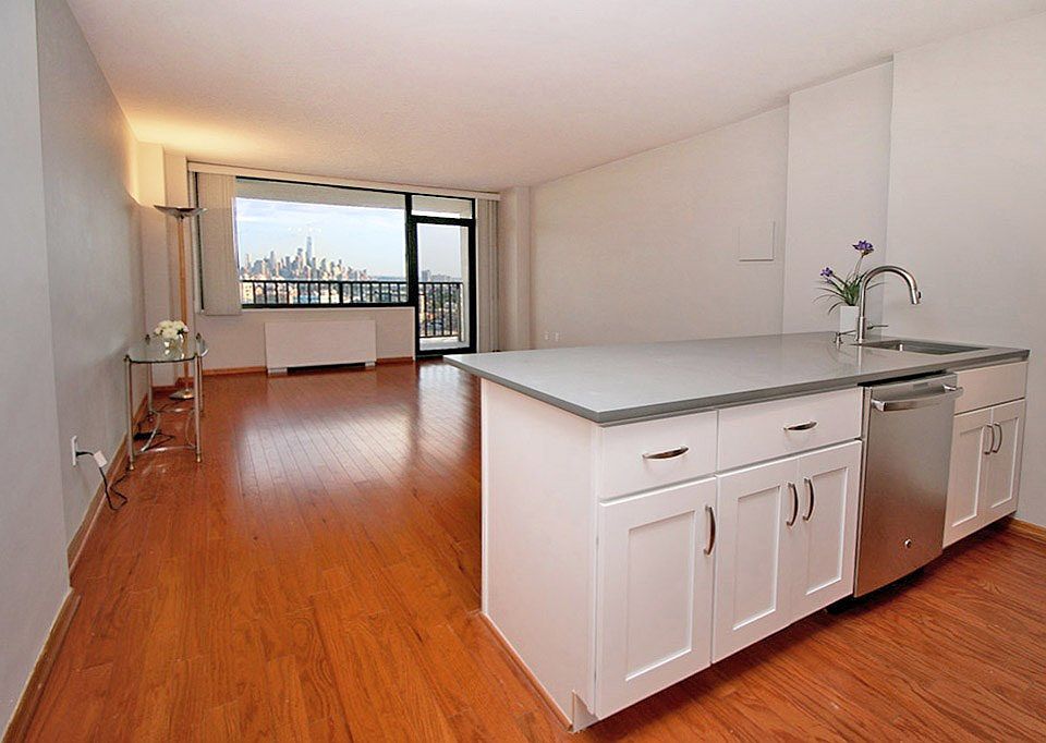 Mind-blowing NYC view! Huge terrace! Enjoy balmy breezes and ever-changing Hudson River action from your huge terrace directly facing the magnificent New York City skyline. This lovely one-bedroom has big picture windows, beautiful hardwood floors throughout, four closets, new kitchen with white shaker wood cabinets, quartzite counter and stainless appliances; updated bathroom. Transportation is easy with NYC buses, ferry and PATH shuttles at front door during rush hours. Rent includes ALL utilities (heat/hot water, AC, electric!) plus high-speed Internet and cable TV with 2 boxes, HBO & Showtime. Landlord pays $500 move-in fee! Building has 24/7 concierge and security, free use of seasonal swimming pool, garage parking, and gym for reasonable extra fees. 1 cat OK. Sorry, the building does not allow dogs.