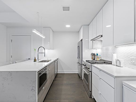 This Top Floor Penthouse unit with extraordinary finishes including: 8" oak floors, Custom Closets in every room ($10k), Dual-tone UltraCraft cabinets with Legrabox Blum drawers, Jenn-Air stainless appliances, Apogee undermount steel sink, porcelain mosaic backsplashes, vented hoods and Carrara Grigio waterfall counters. The bathroom in this HUGE 2 bedroom is finished with European tile, wall hung vanity in the master suite and rain showerheads. Enjoy central air/heat, large Pella designer casement windows high ceilings and walk in closet. The expansive green roof and garden has BBQ areas and an outdoor screening room. A convenient state of the art fitness center, bike storage, a virtual doorman, secured package room and a children's playroom completes this perfect picture. Easily stroll to PATH trains, parks and nightlife. Owner is a licensed real estate agent.