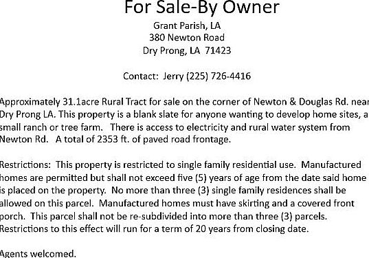 For Sale By Owner- 31.1 Acre Rural property on the corner of Newton & Douglas Rd. near Dry Prong, LA. The property is a blank slate for anyone wanting to develop homesites, a small ranch or tree farm. Some restrictions apply. Buyer's agents welcome.