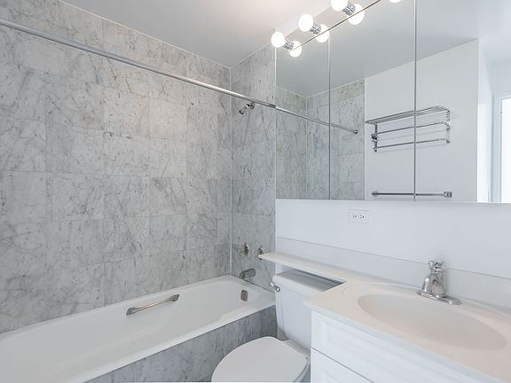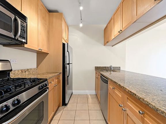 This south facing 1BR/1BA residence features excellent natural light. The galley kitchen includes stainless steel appliances and dishwasher. The stone countertops and cabinetry highlight a warm and neutral palette. The bathroom features Cararra marble floors and wall tiles. The spacious bedroom features large closets and southern exposure.