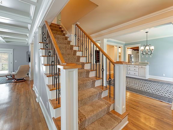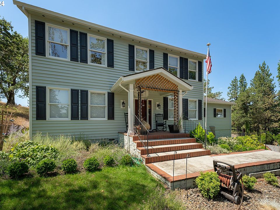 Beautiful Colonial Style home with many upgrades, including high end cabinetry, granite slab counters, stainless steel appliances, custom tile work and vanities! Hardwood flooring throughout! Formal living room with gas fireplace. Office with custom bookshelves, desk and french doors to back deck. Spacious owner's suite with two walk-in closets and woodburning fireplace! Main floor living areas feature coffered and beamed ceilings. Large partially covered deck for outdoor entertaining overlooking the back yard and tree covered hillside. Partially fenced yard and sprinkler system
