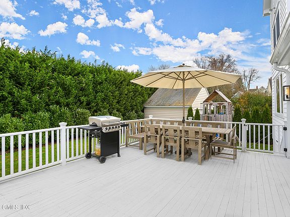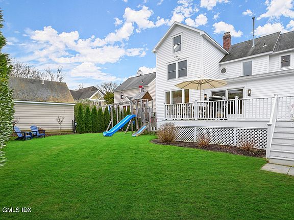 Stunning, turnkey 5 bed, 5 bath shore Colonial in the heart of Old Greenwich. Gorgeous 2022 renovation by Wernert Construction with open floor plan. Spectacular sunlit kitchen w 9.5' marble island, Thermador appliances + wet bar. Adjacent family and dining rms w french doors open to deck and private backyard. New mudroom w full bath. Formal LR with FP. 2nd flr boasts a fully renovated primary bedroom suite incl a walk-in closet + marble bath, 3 dbl bedrooms + 2 completely renovated baths. Fully finished 3rd flr has a large, newly carpeted playroom, renovated full bath + 5th bedroom. Level, fully fenced-in property edged w arborvitae + hydrangea. Gated circular drive with plenty of parking. New HVAC. Sidewalk to school, town + train. Bike to Tods Point beach. A truly rare Old Greenwich gem