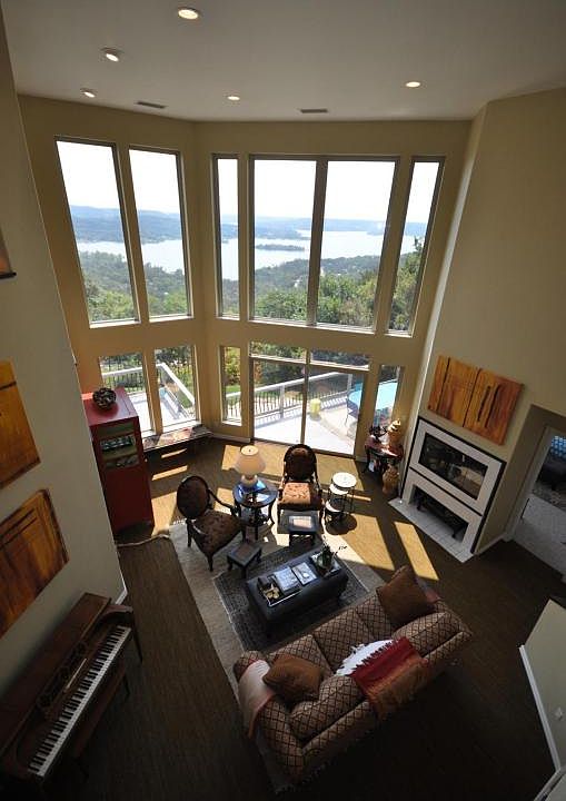 Complete HGTV remodel on this contemporary lakeview home! The biggest lakeview! Custom 4600 plus sq. ft., 4 bedroom, 3 1/2 bath plus office, 2 story great room with fireplace, gourmet kitchen with commercial appliances, mud room, family/media room with wet bar, spa & exercise room w/ 6 person dry sauna, John Deere room, whole house sound system, outside playground/firepit area, multiple decks, gated lakefront subdivision with marina, clubhouse, pools & tennis court! 9 miles to Branson.