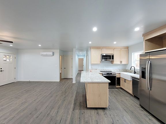 Open floor plan, natural lighting, and luxury vinyl plank flooring throughout the house. The kitchen has matching stainless steel appliances, granite counters, bar seating, lots of cabinet space, and a farmhouse sink. Tiled shower/tub in the bathroom. The living room and the bedrooms all have separately controlled heating/air as well as ceiling fans. Bedrooms have spacious closets.