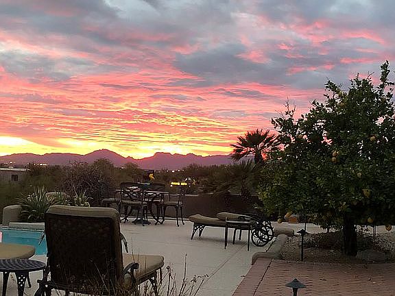 Enter a charming courtyard with tiered fountain SantaFe style home with fabulous 240 degree southern, western and eastern views. The Catalina mountains views from the front include Finger Rock. 5 bedrooms and a bunk room for kids with an office. 3 fireplaces, in the living and dining space the family room and the sitting room off master suite. But outside there’s one more for frosty evenings while sitting around watching the sunset or roasting a few marshmallows. There are walking paths outside which circle the property with saguaros, ocotillos, mesquite, and barrel cactus. Citrus trees for a fresh grapefruit or kumquats that are tart & sweet, lemons for your favorite beverages. The travertine floors are easy to care for and bedrooms are carpeted. Spacious but cozy with a southwest flavor that makes it a lovely home to live in.
