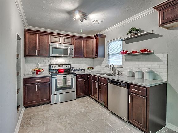 Darling remodeled home in NW OKC. 3 bed 1 bath, 1 car carport. Lovely Curb appeal will grab your attention with new reclaimed wood art, picture window, and red front door. New HVAC, original wood floor, new tile flooring, crown molding light fixtures, plumbing fixtures. Living room is full of natural light from the window and French door leading to a great open deck. Cedar open shelves are arranged in smart corners for storage. Beautiful Cedar beam to separate dining and kitchen. Kitchen is beautiful with new cabinets, granite countertop, under-mounted SS sink, SS appliances, subway tiles and restaurant shelves. Updated bathroom with new subway tiles, vanity and toilet. Beautiful deck for entertainment. This house is CUTE CUTE CUTE!!!! Convenient location in central NW OKC.