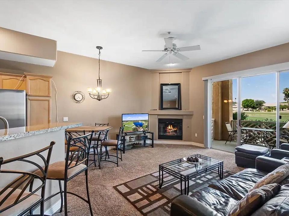 Manicured golf courseOpen-concept designWell-appointed kitchenSunlit living spaceExpansive glass sliding doorsCharming entryway