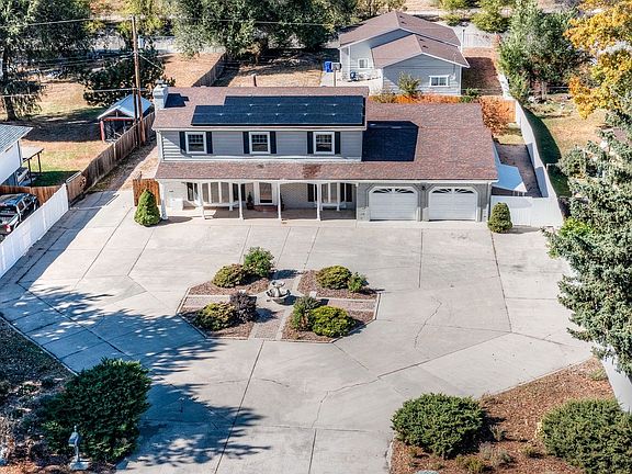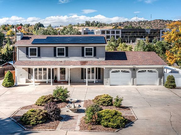 Beautiful 2 Story Home with solar panels centrally located by UCCS and only a few minutes from I-25, Powers, Shopping, Hospitals, Entertainment, Military Bases and just down the road from Colorado Springs Country Club. Home has great curb appeal with a circular driveway that includes plenty of parking and a nicely landscaped frontyard and fully fenced backyard with a large covered deck. Enter the home into the open floor plan main living room with wood fireplace and built-ins, engineered hardwood floors throughout, and a gourment kitchen with double ovens, large island, quartz countertops with lots of counter space, gas stovetop with decorative hood and pot filler, stainless steel appliances, pantry, and extra prep area with additional prep sink. Enter through the french doors to the large sunroom with slate flooring and another set of french doors will take you to the large covered deck. Once back inside, venture down the back hallway into the full bath with tons of storage and closet space, and entrace to large, oversized garage with storage closet and work bench and cabinet. Rounding out the main level is the laundry room with washer/dryer, cabinets, and half bath. Walk up the hardwood staircase to find five bedrooms and 2 bathrooms with the primary bedroom on the one end of the hallway with hardwood floors and ensuite luxury bath and 4 other bedrooms with built-in bookcases, and new carpet. All bedrooms have new high efficiency ceiling fans, and new paint. Rounding out the top floor is another luxury hallway full bath. The main level has AC, and primary bathroom has radiant heated flooring. Don't miss out on the opportunity to call this house your home with a large oversized two car garage, solar panels which greatly lowers your electric bill, wood burning fireplace, huge sunroom, gourmet kitchen, and ceiling fans through out.