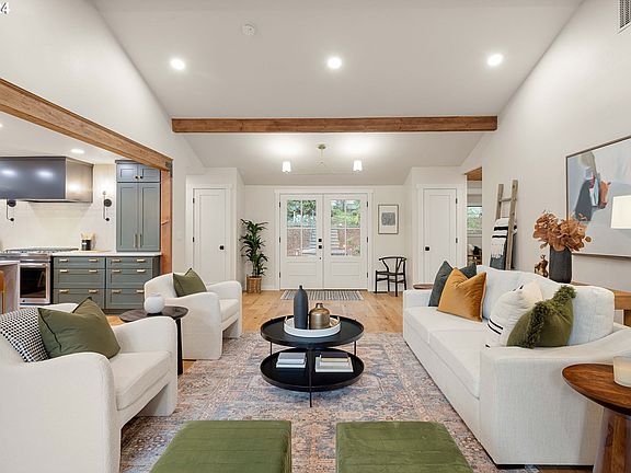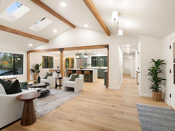 Welcome home to this beautifully renovated modern home in the highly coveted Spring Blvd neighborhood of South Eugene. This incredible property has been fully remodeled with an open concept great room, vaulted and beamed ceilings and high end finishes throughout. Thoughtfully designed, this 2320 sqft, single level home features two primary bedrooms with ensuites, as well as two additional guest bedrooms and another full guest bath. Need more living area? One of the primary suites can easily flex as a second family room with a lovely fireplace.On entry, take in the warmth of the European white oak hardwood floors, the light and bright great room with floor-to-ceiling stone fireplace, the beautiful quartz countertops with waterfall island, the JennAir professional kitchen appliances and the stunning light fixtures and hardware tying it all together. The entire home combines elegance and function with timeless design and modern touches. From the serene color palette to the luxe finishes, every detail was crafted to create a peaceful retreat. You will also find plenty of storage including a butler’s pantry, laundry room, mudroom area and an additional unfinished 15x15 lower level room ideal for a studio or workshop. Love to entertain? Do not miss the expansive deck and fully fenced backyard on the spacious corner lot.This special property is not to be missed!