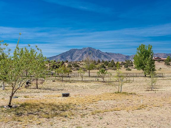 Williamson Valley Ranch home w/stunning view of Granite Mountain.On dead end paved street w/access to Deep Well Ranch. 3 level acres,fenced w/trees, good well, land to build a large main house. Horses, livestock allowed.Unusual floor plan, home was to be guest house. 5000+ sq. ft. main home was never built. Single level w/3 bdrm, large master bedroom, 2 baths. No large master bath, but could be easily added. Great room w/wood burning fireplace. Kitchen w/hickory cabinets, granite. Attached 37'x20'RV garage & additional garage. Dog run, pump house w/2600 gallon storage tank. Back up generator,2 buried tanks totaling 1500 gallon propane,2 extra out buildings. Fabulous neighborhood! Wonderful as is or perfect for buyer wanting to build larger main house. Priced under 3/18 appraisal of $590