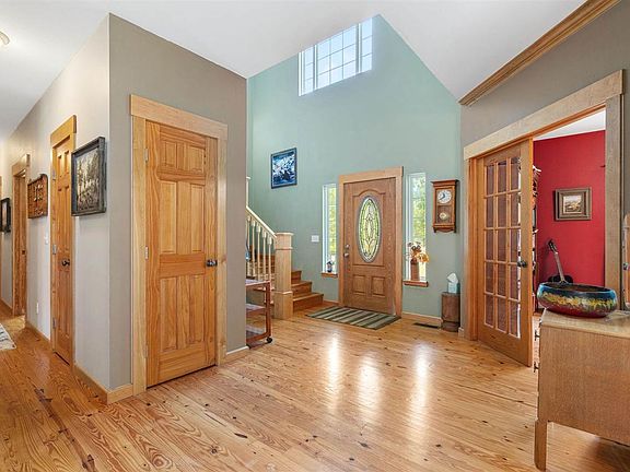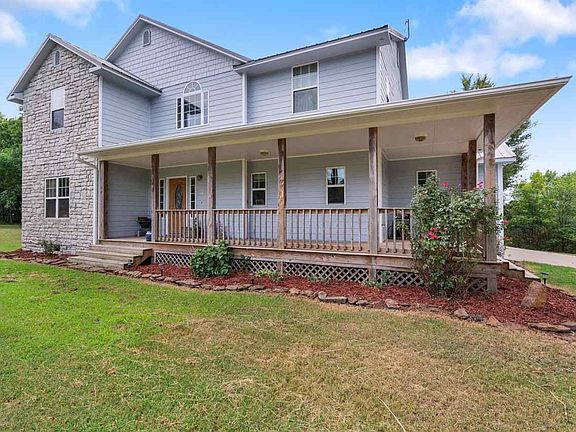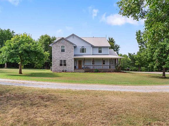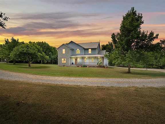 Discover your private retreat with this stunning custom-built home nestled on 9.96 acres of tranquil land, surrounded by trees on three sides. This spacious 4-bedroom, 3-bathroom home offers the perfect blend of seclusion and luxury, just a short drive from the conveniences of town. As you approach the property, a private driveway leads you to this charming residence. Step inside to be greeted by beautiful real wood floors, tall ceilings, and a welcoming staircase. The oversized living room, complete with a gas fireplace and abundant windows, provides serene views of the surrounding trees and fields. The kitchen is a dream, featuring ample countertop space, real wood cabinets, and a double oven. Enjoy your meals in the dining area or step out onto the screened-in patio for an outside dining experience. The home’s design includes multiple outdoor spaces, with a large deck accessible from the upstairs sitting room and master bedroom, offering breathtaking wooded views. Upstairs, you’ll find three well-appointed bedrooms plus a versatile bonus area, ideal for a TV lounge, playroom, or office. The master bedroom is a true retreat with its own fireplace, spacious bathroom with a jetted tub, and private access to the outdoor deck. The second bathroom is thoughtfully designed in a Jack-and-Jill style, connected to one of the bedrooms. The home is filled with thoughtful features, including upstairs and downstairs laundry rooms, an oversized garage with a work area and storm shelter, and a central vacuum system. The pine wood floors and matching woodwork throughout add to the home’s warm, rustic charm. This home is the epitome of secluded country living with modern comforts. This property offers the best of both worlds—a peaceful countryside setting with all the amenities of a luxury home.