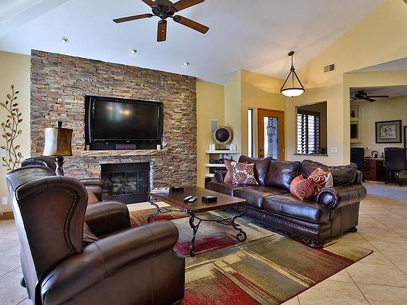 ''Captivating''! Massive ''southern views'' from the custom golf course patio. Panoramic views of ''4'' fairways, water & mountains. You know what they say about LOCATION this is it! Very ''rare highly desirable'' Vista B 1536 sf. 2 Bedrooms 2 Baths & a custom den/office. End unit no one above, perfect pool location! Direct 2 car garage access into home, BIG PLUS! Reconfigured Main living area layout including the Kitchen & Dining room. ''Open Great Room'' feeling. Custom fireplace, wet bar, wine frig. Reconfigured Chef Kitchen, custom cabinets, gas range, slab Granite, stainless appliances & lots of counter space. Pendant lights, canned lighting, tile throughout & 8' interior doors (4). Furnished, move-in ready! Fabulous Master remodeled ''ensuite'' 2nd Bedroom & Bath remodeled. Custom Office, slab granite desk top, sleeper couch, TV. Exceptional golf course patio. Includes Fireplace, built-in BBQ, Awning, fire pit on island seating. Views are amazing & a must see! Outdoor living we love in the Desert. Separate Laundry room. 2 car garage or 1 car & golf cart. Rare opportunity to purchase this reconfigured furnished floor plan! PRICED TO SELL.