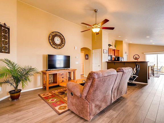Fantastic ranch home with beautifully finished walkout basement. This open floor plan's main level boasts spacious family room with vaulted ceilings and just installed silver oak plank flooring throughout--absolutely gorgeous! The kitchen with upgraded cabinetry includes all appliances, custom tiled backsplash and island with wood counter, and opens to deck. The master suite is spacious and offers adjacent bath. Study can also be a 3rd bedroom on main if desired. The finished walkout basement is a WOW! Built in custom bar and media room-- included! An entertainer's dream! Additional bedroom/bath and recreation area with abundant storage also in lower level. The patio and beautifully landscaped private lot are ready for your summer time enjoyment. Backs to open space and within walking distance to regional park, area school, community clubhouse and pool and dog park. This home has it all and is move in ready!