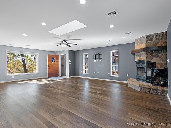 Rustic Beauty sits on 5 wooded acres with a view of the Osage, Home has open large entry with 1/2 bath, expands to open living with fireplace featuring a blower, that can heat the entire home if needed. Kitchen has Island, and oversized eating space. Primary Bedroom is downstairs with updated bathroom featuring a massive walk in shower. 3 Bedrooms and Hall Bath upstairs. Secluded setting on a dead end lane with nature 360! Circle drive and 2 Car detached garage with an apartment that has its own 911 address and mailbox giving your loved one a sense of independence, as well as the ability for rental income. Apartment has Living room Kitchen combo with 2 bedrooms, 1 bath and an additional room that could be an Office/Exercise/Storage and utility room. Garage is two car with overhead doors and separate entrance apart from apartment. Newer roof Heat and Air. Bus Stop option for Bartlesville Schools just down the road.