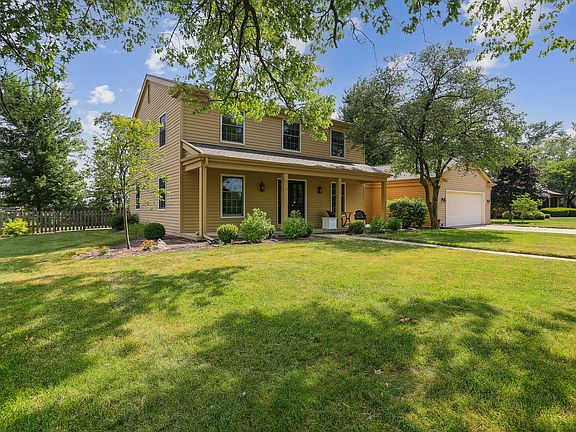 Farhills Drive in South West Champaign offers a charming approach to your new home in Lincolnshire Fields. With a New Roof (2021) and recently stained exterior, this home is nestled on a spacious corner lot, on a beautiful tree-lined street. This home features a private, park-like setting with mature landscaping and views of the 11th tee from the front porch. Inside, enjoy a bright living room with built-ins, a formal dining room, and an updated kitchen with stainless steel appliances, quartz countertops, and a coffee/wine bar. The first-floor bedroom, currently an office, has ample shelving and a view of the front yard. The expansive family room, with a fireplace, leads to a paved patio perfect for entertaining. The ground floor also includes a powder room and a laundry/mudroom. Upstairs, the primary suite offers a walk-in closet and an En Suite bath with a double vanity, jacuzzi tub, and walk-in shower. Two additional bedrooms share a full bath. The two-car garage includes a room for storage or a workshop. Enjoy the added benefit of lower county taxes, making this property even more appealing. Inspection Report is on file. The bus stops right next to this home for your convenience. Be sure to note the large side yard too.