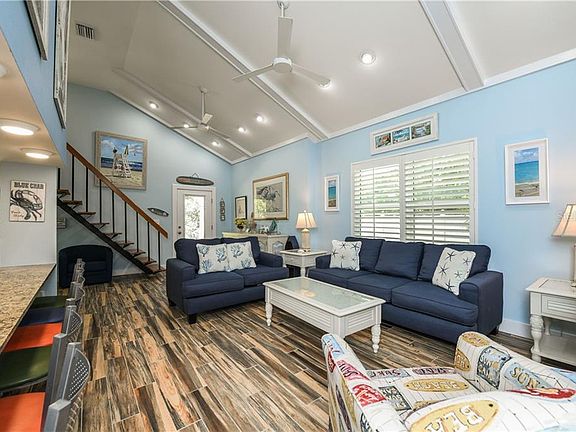 Located just a few steps to the beach with easy access. This gorgeous 4 bedroom property+ sleeping loft was recently renovated from top to bottom. Peeks of the Gulf and beach. New flooring throughout, new kitchen & bathrooms. Stainless steel appliances and nice finishes. This property currently consists of two units- the main space is a three bedroom + loft, and there is also a one bedroom upper level full unit. The main living space has a two story, vaulted ceiling in the living room with lots of natural light. Great open floor plan between the living, kitchen & dining spaces. Exceptional decor with a nautical, beachy theme makes this the perfect island getaway. Mature, tropical landscaping and multiple spaces to enjoy outdoor dining or activities. Ideal island location allows just a short walk to several dining spots, shopping and more.