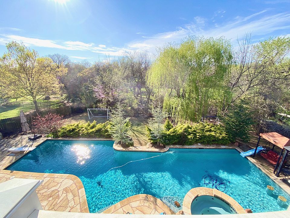 Over $300,000 spent on vacation resort pool and swim-up bar! Reactivated with a $15,000 price enhancement and some fresh interior paint (new photos this week!). Private/treed lot with a creek, direct access to Mitch Park, easy access to I-35 and OK-74! Your home is 5 minutes from Oak Tree Country Club. Entertain from your breathtaking 60-foot in-ground pool, built-in hot tub, gazebo with swim-up bar all overlooking a greenbelt. Your new home has geothermal heating and cooling (a $50K upgrade)! Inside you will find real hardwood floors, granite counters, an open floor plan, 4 bedrooms, 3.5 baths, and 4 living areas. The bonus room ($80K) has built-ins for a home office setup, an 18-ft wood beam ceiling & 18x14 Trex balcony. There is also a 29x18 theater/game room & a formal study. Additionally--storm shelter, sprinkler, oversized sideload 3-car garage, in-ground trampoline, & secondary outdoor living area w/ geothermal plumbing ran. $2,500 carpet allowance w/ acceptable offer.