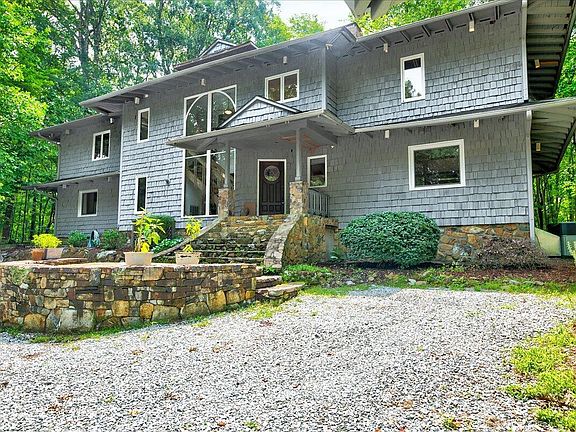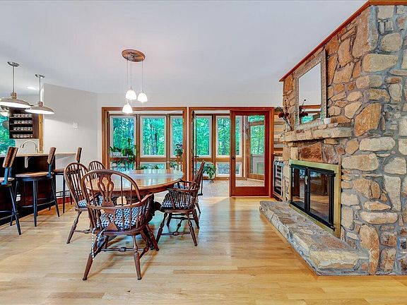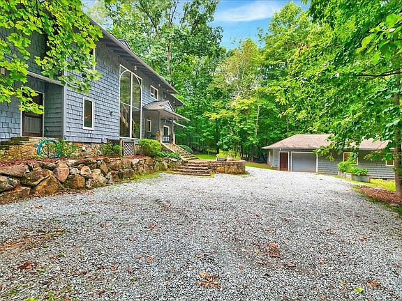 Welcome to the House of Glass, a unique sanctuary nestled on 4 stunning wooded acres. This architectural masterpiece designed by Knox Tate offers a harmonious blend of modern design and natural beauty, with expansive windows that invite abundant sunlight and serene wooded views into every corner of the home. As you enter, you're greeted by an open-concept living space, a wooden floating staircase, and floor-to-ceiling arched windows. The dining area is perfect for entertaining, centered around a double-sided wood-burning fireplace. The family room boasts a charming spiral staircase leading to a library adorned with built-in shelves, creating the ideal retreat for book lovers. The kitchen is equipped with high-end appliances and a cozy breakfast nook. Adjacent to the dining area, you'll find a bright sunroom flooded with natural light - the perfect spot for nurturing plants or escaping with a good book. Past the kitchen, a versatile guest room doubles as a second family room, complete with French doors opening to a wooden deck. Upstairs, you'll find three additional bedrooms, a dedicated office, a library, and a full bath. The primary bedroom features a wood-burning fireplace, a loft area, and a reading nook surrounded by windows. An updated primary bath and a spacious cedar-lined closet complete this space. Down the hall, discover three more rooms and a full bath. Two of these rooms feature lofts, adaptable for twin or queen-sized mattresses. This home lives like a four-bedroom, with multiple options for home offices throughout. Outside, you will find a one-car garage with a Tesla Charger plus a 570 sq ft. workshop equipped with a built-in AC unit, lighting, and storage galore. Whether you seek tranquility, creativity, or connection to nature, the House of Glass delivers an exceptional living experience.