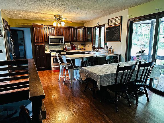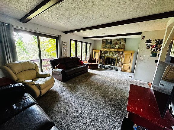 Unique 40 acre wooded parcel with ranch style home, walkout basement, looking out to a spring fed pond with sandy beach area, and East Trout Lake. Wildlife galore is a prime deer hunters dream and fishing in the lake and a branch of the Tobacco River. In addition to the paved circle driveway, sits a hunters cabin that could be an air bnb income property or in-laws retreat. Two pole barns sit in between cabin providing a ton of storage and/or workshops. All hidden in a private, peaceful setting along historic old 27/Clare Avenue