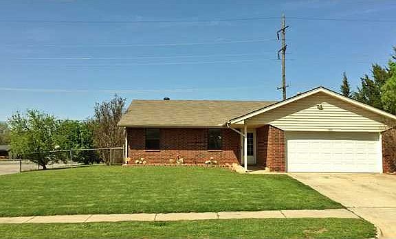 EXCELLENT LOCATION!! CORNER LOT. NICE SPACIOUS LIVING ROOM W/FIREPLACE AND CEILING FAN, OPEN FLOOR PLAN TO DINING AND KITCHEN,LOTS OF STORAGE SPACE W/ ENCLOSED PATIO,FENCED IN BACKYARD. CLOSE TO A MOST SHOPPING, DINING, ENTERTAINMENT AND TINKER AIR FORCE BASE. READY TO MOVE IN JUST IN TIME FOR SPRING!!