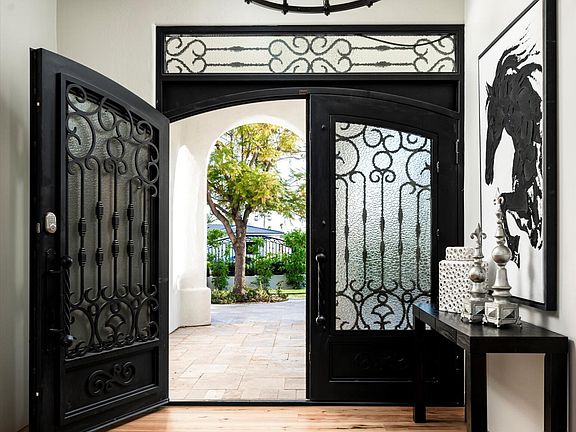 Behind the double wrought iron doors, the home unfolds with a sense of volume and warmth—vaulted ceilings, arched transitions, and multiple French doors provide an airy, connected layout. The main living space is made for both entertaining and everyday comfort, with a generously sized family room, formal dining area, and an expansive media room for movie nights or game day gatherings.