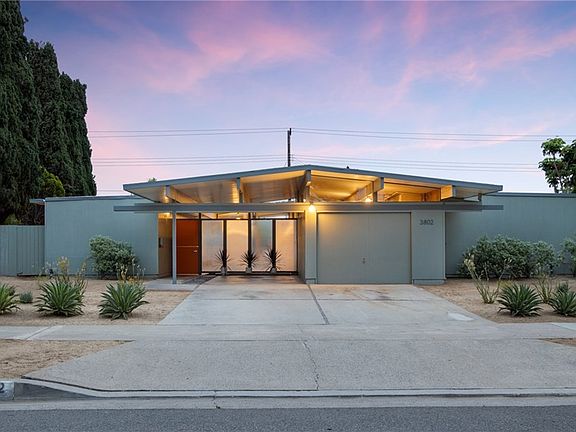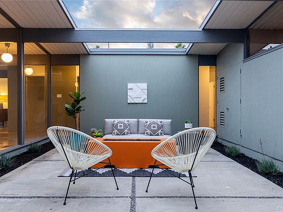 Midcentury style and modern comforts await in this historic Eichler home in the desirable Fairhaven tract of Orange. Designed by renowned architects A. Quincy Jones and Frederick Emmons, this residence delivers the indoor/outdoor living experience that have made Eichler homes some of the most celebrated and sought-after properties in California. Floor to ceiling windows and sliding glass doors bring natural light into the living areas, and pitched open beam, tongue and groove ceilings add to the sense of space and dramatic architectural lines. Entry into the home is through the iconic open-air atrium that serves as an intriguing precursor to the style and atmosphere that awaits within. Stepping into the home, you are greeted by a dramatic and expansive great room that features a cozy living room with stacked block fireplace, a large open kitchen with breakfast bar, and a spacious dining area. The oversized master bedroom is a retreat that takes up the entire east wing of the house, with a newly renovated master bath with glass tile, a private courtyard space, and an enormous walk in closet with its own sliding glass connection to the outdoors. On the opposite side of the home is the west wing featuring three bedrooms, recently renovated guest bathroom, and separate laundry room. And then there is the backyard and pool area, accented with built-in vintage starburst blue and white umbrella and chair sets, and seating and entertainment areas overlooking a large sparkling pool.