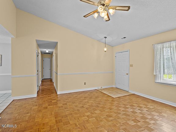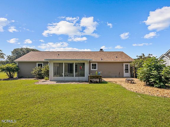 Welcome to the beautiful city of New Bern! Situated in Lakeview Estates subdivision, this charming 3-bedroom, 2-bathroom home could be just what you have been waiting for! Upon entering the home, you are greeted with large, vaulted ceilings in the living space, parquet flooring, fireplace, and plenty of natural light. Off of the living space, there is a beautiful galley kitchen/dining room combo featuring stainless steel appliances, tile flooring, fresh paint and plenty of cabinet space. The kitchen is nestled in between the garage access and the beautiful, tiled sunroom with double French doors! This sunroom is fully enclosed, with full sun, ceiling fans, retractable shades, and heating/cooling sources. Such a beautiful feature to enjoy mother nature! This home also has 3 bedrooms, all carpeted with plenty of space. The primary bedroom has a bathroom with a walk-in shower and wainscoting, for added design. There is also a second full bathroom down the hallway. Washer and dryer are also included. You cannot go wrong with the exterior of this home! A brand new 2024 roof, a large open deck off of the sunroom, beautiful garden shrubs, fig tree and so much more adding to the curb appeal. The large, open back yard with a storage shed, has plenty of open space to entertain! This home will not last long! Schedule a showing today! Vacant and ready for its new owner!