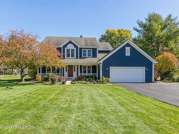 MOVE-IN READY. A Classic Naval exterior with a contrasting front porch gets an A+ in curb appeal on this charming 4 bdrm. home in sought after Squaw Creek subdivision. Situated on over .75 acre homesite, it is WALKING DISTANCE to TOP Prairie Ridge HS and Prairie Bike path/trail. The home has an AMAZING yard, with a beautiful NEW Trex 23' x 16' maintenance-free deck, a large stone patio with a fire pit surrounded by solar lit string lights, perfect for outdoor entertaining and ambiance. Fully enclosed raised garden beds, and fruit trees are a garden lovers dream. Step inside to a fresh neutral timeless paint color throughout most of the home. The spacious white kitchen with all stainless steel appliances and granite tops is open to the family room, with the warmth of a masonry surround fireplace at its center. Both rooms have sprawling exterior views of a lush green back yard. There are 4 generous bedrooms on the upper level. The spacious primary suite is vaulted and boasts a luxury bath with garden tub, NEW shower, and dual vanities. The basement is finished and offers great add'l hanging out space, or perfect for entertaining. This gem is mins to Metra Train, Northwestern hospital, downtown shops, golfing, Three Oaks Resort, Main Beach, Sternes Woods and Veterans Acre Park and much more. LOW TAXES and SO MANY NICE UPDATES: NEW Furnace/AC/2019, Water Heater/2019, NEW asphalt drive w/ add'l parking space/2018, All NEW Windows 2016-2020., Exterior paint/2020, New gutters/downspouts/2020, Interior paint/2022.