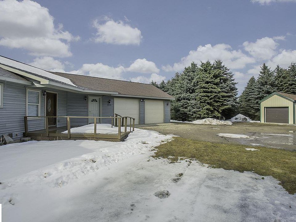 Yearning for the country life? Move right into this 2006-built home on an impressive 30 rolling acres just minutes S of Traverse City. Room for everyone in 5BR/3.5BA ranch plan offering an open-concept/barrier-free layout, vaulted ceilings & full finished walkout lower level. Huge kitchen island & storage pantry, oak hardwood & Italian tile floors throughout, private main floor master suite, convenient mudroom/laundry off garage with 1/2 bath, finished lower level family room, TONS of storage space, covered front porch & rear deck. Attached 2 car garage, detached 1 car garage, 30x48 pole building & storage shed. Whole-house HEPA air filter & on-demand hot water at all faucets. Bring in the horses! Zoning allows for horses & other livestock, with pasture-ready land & plenty of room for additional outbuildings.