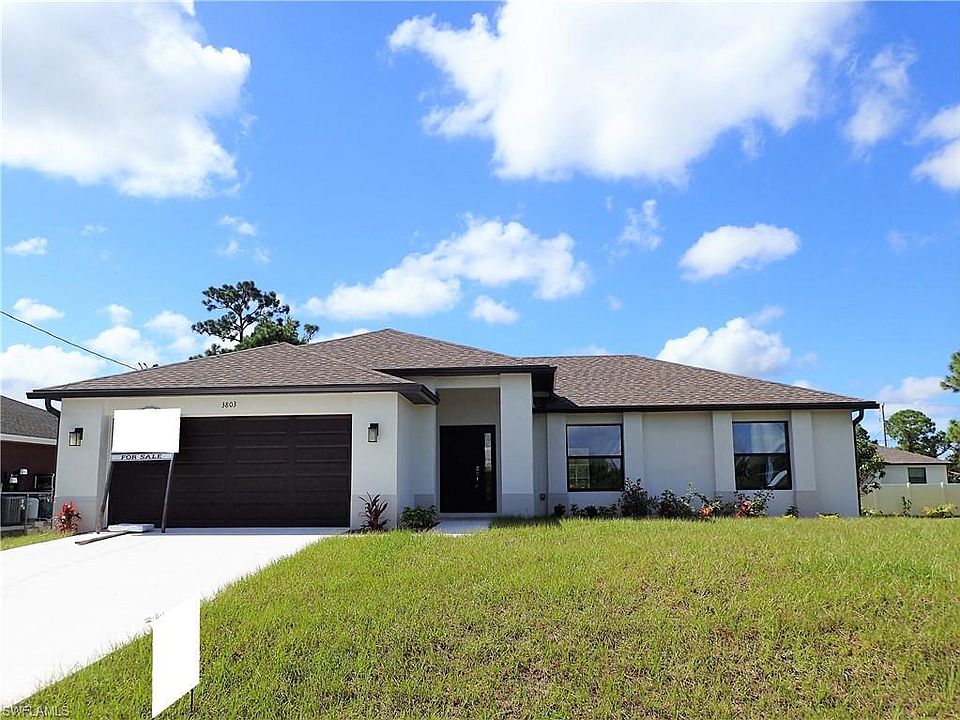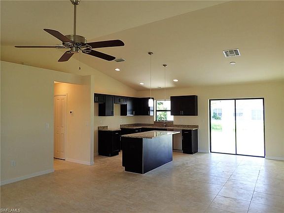 **BRAND NEW, Under construction, to be complete Mid August 2019**Great central location south of Lee Blvd. and West of Sunshine Blvd. Southern exposure and plenty of room to add a pool plus not located in a flood zone, flood insurance may not be mandatory. This great room design home has 3 bedrooms, 2 baths, 2 ceiling fans, split bedrooms, inside laundry room with deep sink and a large (9x20) open lanai. Other features of this home include: 16 seer a/c unit, low E single hung tinted dual panel insulated glass windows, tile floors throughout with carpet in 3 bedrooms, granite countertops in kitchen & bathrooms, master bedroom has tray ceiling, large walk-in closet with a master bath that has dual sinks & walk-in shower. Landscaping to be completed with Bahia sod and miscellaneous shrubs. Stainless steel kitchen appliances to include: side by side refrigerator, dishwasher, microwave & range (to be delivered a couple days prior to closing). Builder is VA approved.