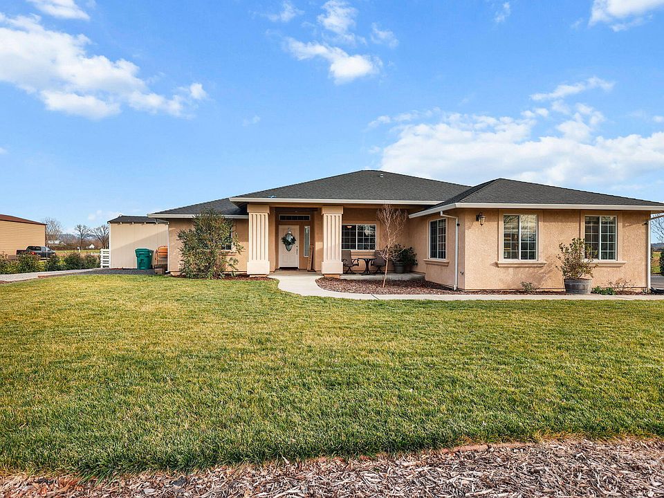 Impeccable country home on irrigated land with breathtaking views of Mount Lassen. This newer-build stucco home offers a desirable split floor plan with three bedrooms plus a versatile office or optional fourth bedroom. Meticulously maintained front and back landscaping showcases true pride of ownership. The open-concept design is ideal for entertaining and features granite countertops throughout, a cozy fireplace, and abundant natural light. Fenced acreage provides space for animals, while the spacious covered porch offers the perfect place to relax and take in the sweeping views of the property and Lassen!