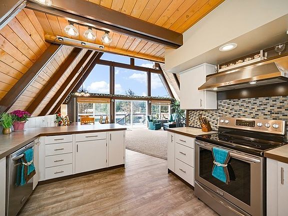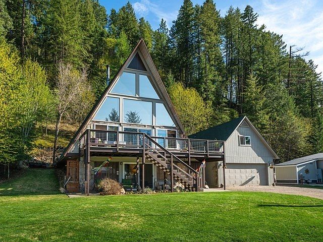 Beautiful A-FRAME DEER LAKE. $10,000 Price Reduction on this year round home. City Sewer & Water! Gorgeous home & property. Beautifully updated! Walkout first floor has bath and living room, spiral staircase to a living/dining and totally upgraded kitchen, bath/laundry and bedroom. loft area up to Master Bedroom and bath. Garage and shop and upstairs a flex room and office. Patios and decks for enjoying and relaxing. Patera internet makes working from home a breeze! Deeded lake access with beach and dock avail. Year round living or Vacation home Do not let this beauty get away!