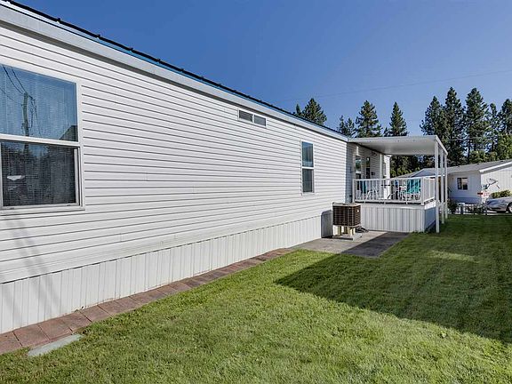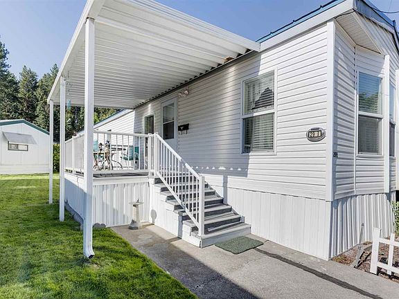 Make yourself at home in this well-maintained, 2000-built 2 bedroom/1 bathroom single wide home made by Fleetwood on leased land located in a well-managed 55+ park surrounded by forest close to nature and downtown Spokane. Enjoy the open floor plan with kitchen adjacent to living room and the hall to the bedrooms. The front windows allow for so much light into the kitchen and the dining area. Did we mention, all the appliances stay?! Outside you'll find lush green grass as well as several mature plants, a storage shed, and an 11X40 carport with a concrete floor (unique in the park)! Kick back and enjoy the peace and quiet from your 8X12 front porch. Ask your Realtor to see walkthrough video & 3D floor plan virtual tour!