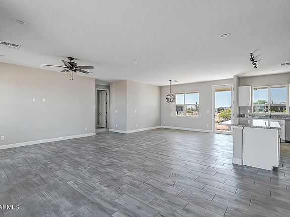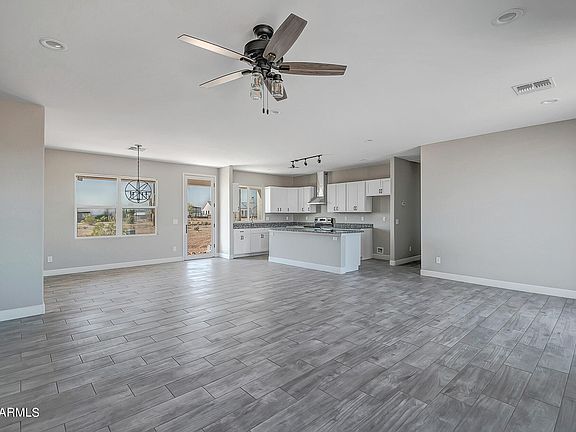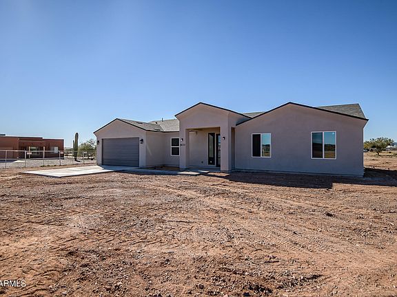 Welcome home! Brand new 4-bed, 2-bath home on over an acre lot! Stunning views of mountains, beautiful natural desert with abundant saguaros, and amazing sunrises & sunsets. Significant curb appeal, including an extended driveway to a 2-car garage. The home is located in a thriving and coveted town and is surrounded by homes/ranches on minimum 1 acre lots. Inside, is a bright open layout with tile flooring & neutral paint throughout. The wide-open kitchen showcases granite counters, an island w/breakfast bar, abundant white cabinetry, and stainless steel appliances. Primary bedroom has a private bath with double sinks, a walk-in closet, and a floor-to-ceiling tiled shower. Out back, there is a covered patio and your acreage provides plenty of space for your horses and toys! Welcome home!