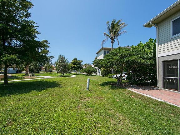 This beautifully furnished three bedroom two bath corner townhouse with only one adjoining condo and easy access on and off the Island even has a peek of the Gulf! There is a City Park on one side with a walkway leading to a 3 minute walk to the beach! Leave your car in your two car garage with an easy walk to the grocery store, 2 pharmacies, hardware store, and restaurants. Nice open floorplan with travertine tile kitchen and bathroom countertops. The oversized master suite has a large shower, double sink, a walk in closet, and custom blinds. There are two covered decks as well a wonderful screened lanai with great patio furniture and bar. Well maintained only 9 unit complex with a community heated pool. Loads of storage, and even an area made to allow for elevator shaft if desired!
