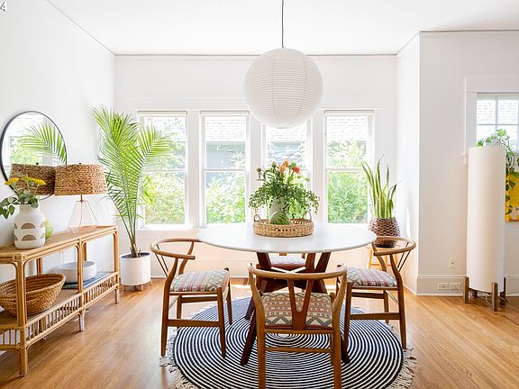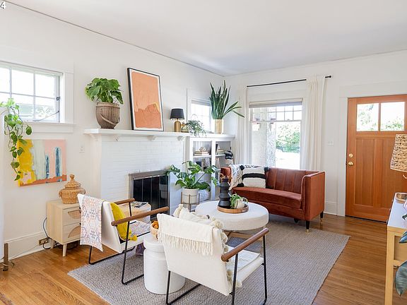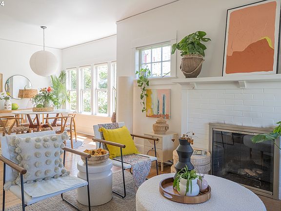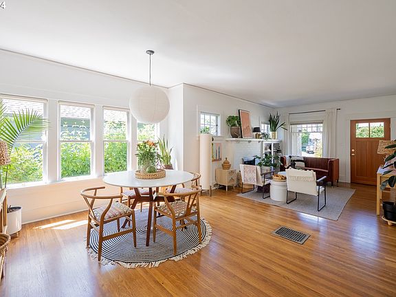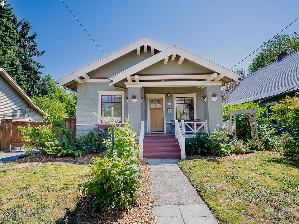 Quintessential Craftsman bungalow, full of historic character yet well-suited for modern living. The charming front porch leads to an airy living and dining room with original wood floors, high ceilings, a cozy fireplace, and walls of windows to let in natural light. The remodeled kitchen is an excellent place to cook with abundant counter and storage space, updated appliances, marmoleum flooring, and views of the lush backyard. Downstairs, find a creative bonus room with exceptionally tall ceilings: utilize this for storage, crafts, or additional living. Relax on the backyard deck and take in the oasis of a yard full of berries, roses, and mature plants. This home has been well-stewarded through the years with a host of updates, including a newer furnace with smart thermostat, newer roof, a/c, and more. Enjoy living on a quiet street while being less than a mile to Reed College, close to the trendy shops and restaurants of Woodstock, and just 2.5 blocks from Trader Joe's. [Home Energy Score = 5. HES Report at https://rpt.greenbuildingregistry.com/hes/OR10229756]