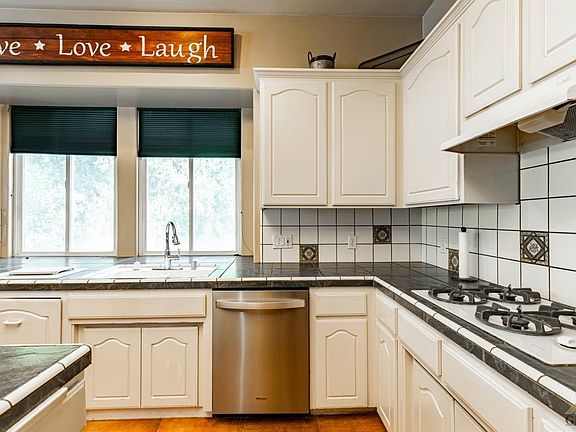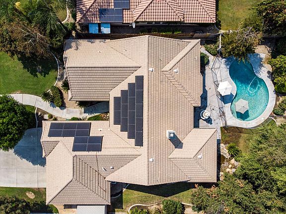 This 2,395 square foot beauty in Stone Creek has numerous upgrades, including an owned 7.8 kw Tesla solar system (purchased for approx. $20,000), newer exterior paint and newer stainless-steel kitchen appliances. The back yard is inviting with a covered patio, sparkling pool surrounded by a fence, waterfall, BBQ and mature landscaping which provides plenty of shade. There is also laminate wood flooring in most rooms (the master has engineered wood flooring). This home features a family room w/ a fireplace, formal dining room, living room with a fireplace and mantle, 3 bedrooms plus a study, 3 baths and a laundry room with lots of cabinets and storage. The spacious kitchen has white cabinets, an island, ss appliances, a wine rack and extra counter and cabinet space. The master suite has wood flooring, a large walk-in closet, dual vanities, a soaking tub and a separate shower.