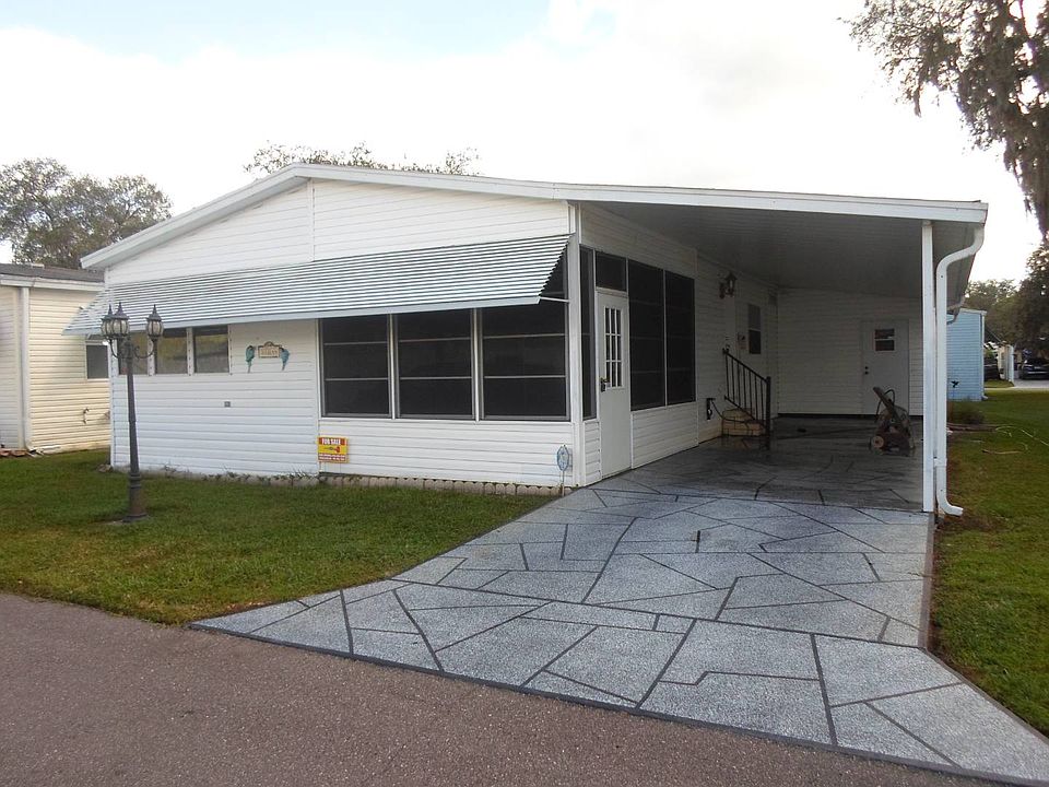 PRICE REDUCED! Motivated to sell! Located in a great active 55 Plus gated community in Zephyrhills FL this home is awesome and perfectly move in ready! The home has two bedrooms and two full baths. Dinning room, living room and kitchen are in an open format. The master bath has a walk in shower and the main bath has a shower tub combo. Both great size. The master bedroom has a pass through closet and will hold tons of clothes. When you walk thru the screen room with vinyl widows you walk into a bonus room that can be used for a den or even office space. Thru there, you walk into the large living room with the dinning area and kitchen on the right side. There is a large pantry as well as hook ups to move your washer and dryer inside if you so choose. The shed is very large and perfect for a hobby area as well as laundry room. the Home also has a glass top stove that was used very little and a fridge with water and ice that was new in 2016. Also, a huge YES" is the central air unit was replaced in December 2019. The lot rent on this home is currently at only $461.00 and this includes Lawn care. The community has much to offer such as a pool, and activities. Very nice small community!