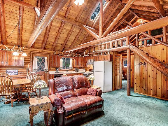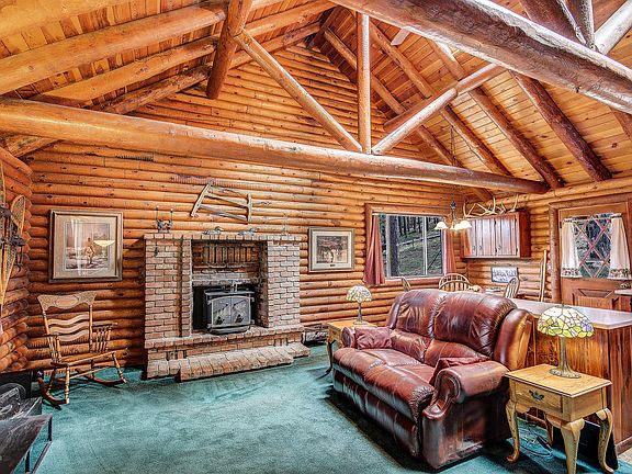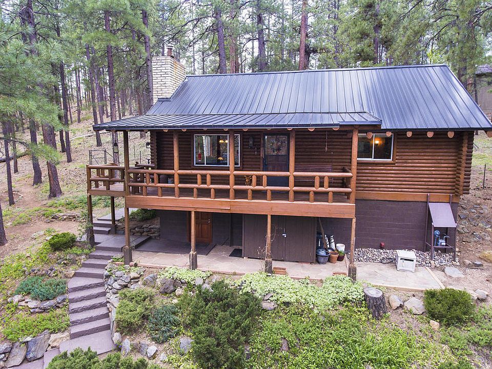 You have found it! An authentic log home that backs National Forest land on a 18,477 square foot, Ponderosa Pine covered lot. Imagine exploring the forest behind the house or soaking in the hot tub on the extensive Flagstone patio. This sturdy home was built with 6''logs and has a metal roof. Two skylights illuminate the living room. The wood stove insert is a wonderful additional heat source in the winter months. Upstairs is a loft area with storage under the eves on both sides. The partially finished and heated basement houses the washer and dryer and provides additional storage. The swing on the covered front porch is a lovely spot to relax, smell the pine and enjoy the mountain views.