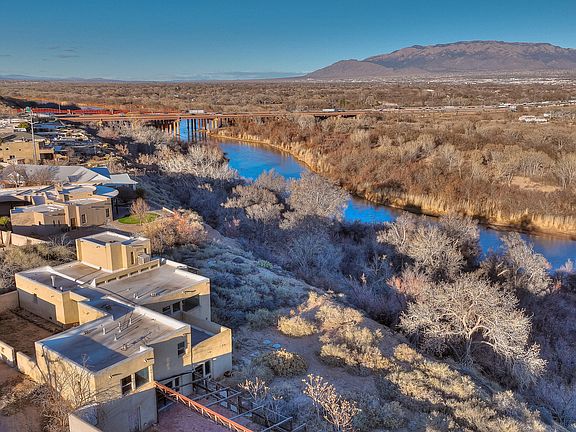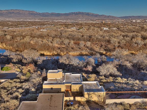 One of a kind adobe home perched above the Rio Grande with spectacular, unobstructed views of the Bosque, City, Sandia, Manzano & Jemez mountains. POTENTIAL BUYERS - please do not walk around property without an appointment or broker. This extraordinary home was designed by architect Richard S Nordhaus and is a rare opportunity to bring this unique hacienda back to it's original glory. Fabulous brick floors, beam ceilings, exposed adobe, stately solid wood interior doors and unique door knobs throughout. The openly connected living room, dining room & kitchen are the heart of the home featuring raised ceilings, clerestory windows, tiled bancos, fireplace & magnificent views around the clock.