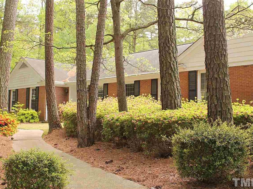 Significant price reduction on this timeless well-built 1-owner, all-brick ranch to allow for updating. Firmly sitting on a wooded, 1+ acre level lot with a gently flowing creek it feels like your own little corner of paradise, yet is 5 mins to 440 & 540 as well as only 15 mins to the heart of downtown. Finished basement is pre-plumbed for bath. Gas log FP in FR. Garage workshop, 2 outbuildings. Large deck overlooks private yard. You can just tell when a home has been loved like this No city taxes or HOA.