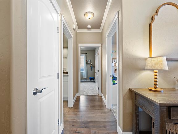 MLS# 287837 Built in 2018, this stunning stucco home offers the perfect blend of modern design and everyday comfort. Featuring 3 spacious bedrooms and 2 bathrooms, the thoughtfully designed split-bedroom floorplan ensures both privacy and functionality.The open-concept kitchen and living area are ideal for entertaining, complete with quartz countertops, a walk-in pantry, under-cabinet lighting, and a stacked-stone gas fireplace. Surround sound enhances the living room experience, while abundant windows fill the space with natural light.Retreat to the luxurious primary suite, boasting a dual vanity, a huge walk-in tile shower, and elegant finishes. Both bathrooms feature quartz countertops and dual vanities, adding style and convenience.Additional highlights include LVP flooring with carpet in bedrooms and tile in the primary bath, a mudroom with built-in cubbies and coat racks, and a spacious finished 3-car garage. The backyard is fully enclosed with stone block fencing and offers a covered patio perfect for relaxing or hosting gatherings.This home is truly move-in ready and combines modern finishes with exceptional comfort.